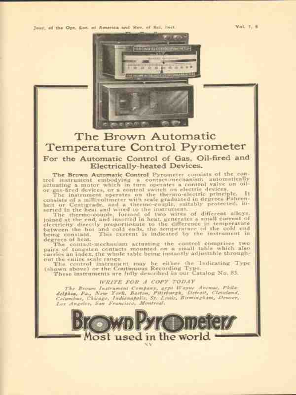 Original vintage optical trade magazine ad for THE BROWN INSTRUMENT COMPANY. Main office and factory was located in Philadelphia, PA. Automatically Control Your Temperatures to Within 10 degrees. Brown Long Distance Indicating and Recording Thermometers and Pyrometers. Old 1923 optical laboratory instruments advertisement.