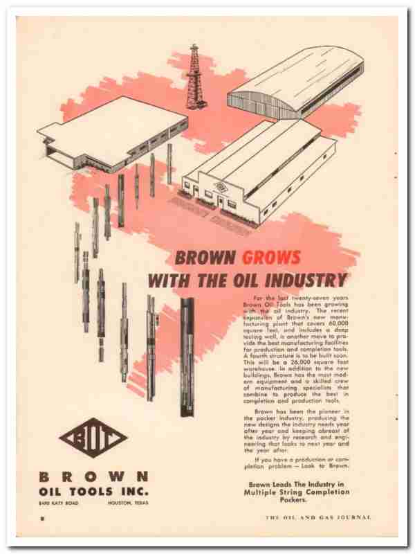Original oil and gas trade magazine vintage ad for BROWN OIL TOOLS, INC. Main office and plant was located at 8490 Katy Road, Houston, Texas. Brown grows with the oil industry! For the last twenty-seven years, Brown Oil Tools has been growing with the oil industry. The resent expansion of Browns new manufacturing plant that covers 60,000 square feet ,and includes a deep testing well, is another move to provide the best manufacturing facilities for production and completion tools. This unique 1957 old oilfield petroleum drilling equipment magazine advertisement would display beautifully matted and framed. Nice graphics.