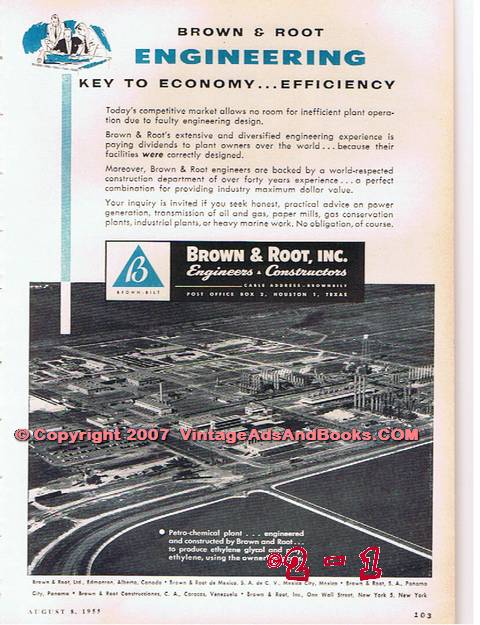 Original oil and gas trade magazine vintage ad for BROWN & ROOT, INC. of Houston, TX. Engineers, Constructors, Brown & Root Engineering Key to Economy . . Efficiency. Petro-chemical Plant ...engineered and constructed by Brown and Root...to produce ethylene glycol and poly-ethylene, using the owner's process. Unique 1955 old petroleum refining industry magazine advertisement would look sensational matted and framed!