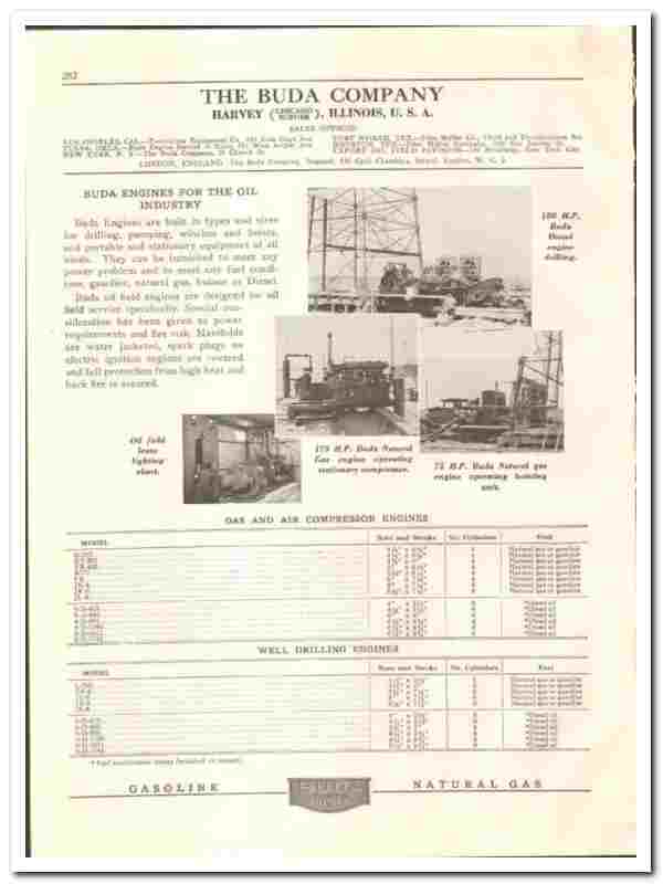 Buda Engines are built in types and sizes for drilling, pumping, winches & hoists, and portable & stationary equipment of all kinds. They can be furnished to meet any power problem and to meet any fuel condition, gasoline, natural gas, butane or diesel.