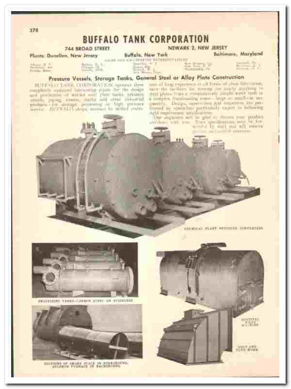 Original 1947 industrial trade vintage catalog for the BUFFALO TANK CORPORATION. Main office was located at 744 Broad Street, Newark, NJ. The plants were located in Dunellen, NJ, in Buffalo, NY and also in Baltimore, MD.