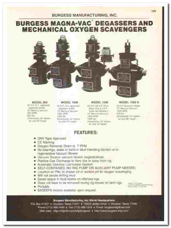 Original 1998 Oil and Gas trade vintage catalog for BURGESS MANUFACTURING, INC. Main office and plant were located at 16529 Jersey Drive, Houston, TX.