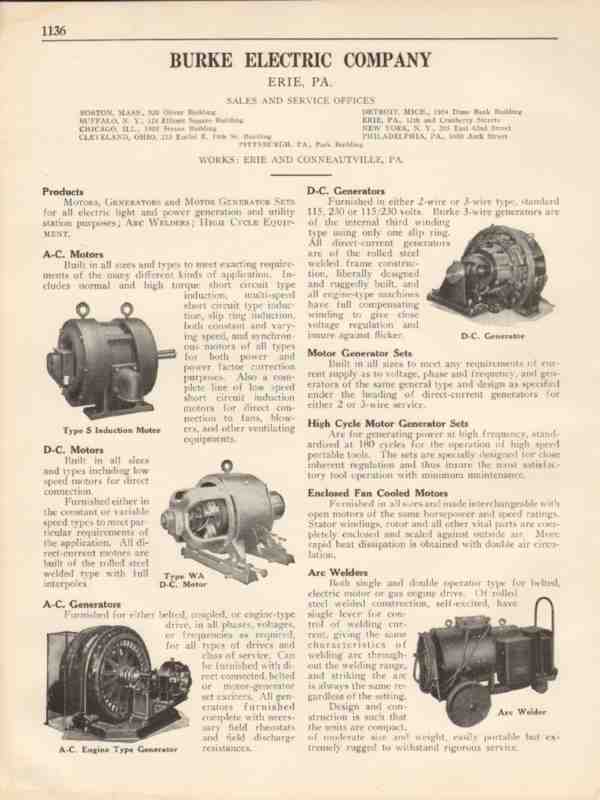 Original electrical trade vintage catalog for BURKE ELECTRIC COMPANY of Erie, PA. Manufacturers of AC-DC Motor, Generator Sets, Enclosed Fan Cooled Motors, Arc Welders for all light and power generation and utility station purposes. High Cycle Equipment. Disbound from a large 1931 architect construction materials book, this unique old one page technical specifications brochure would display wonderfully matted and framed. A marvelous addition to your retro electrical equipment library. Contains a small amount of residual glue on edge. Slight damp stain on outer edge.