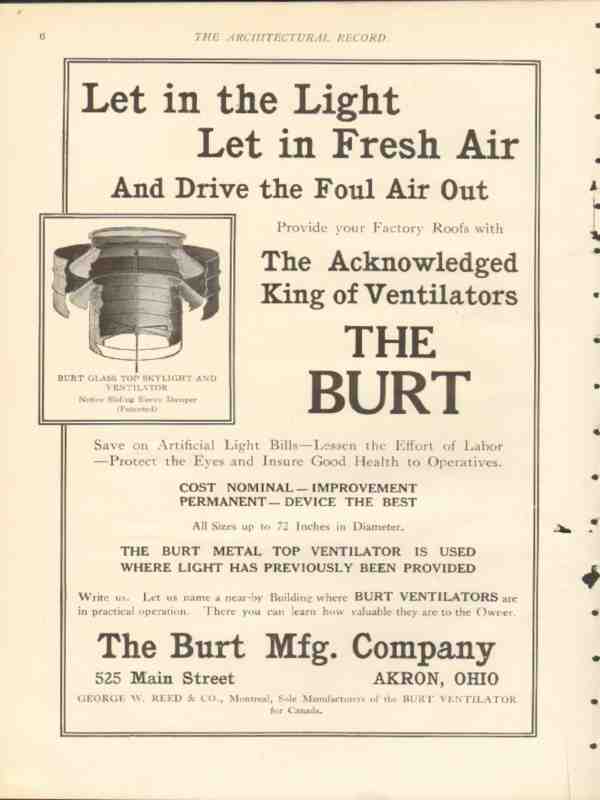 Original vintage architectural trade magazine ad for THE BURT MANUFACTURING COMPANY of Akron, OH. Let in the Light, Let in Fresh Air and Drive the Foul Air Out. Provide your Factory Roofs with The King of Ventilators, The Burt. Old 1912 building construction industry advertisement
