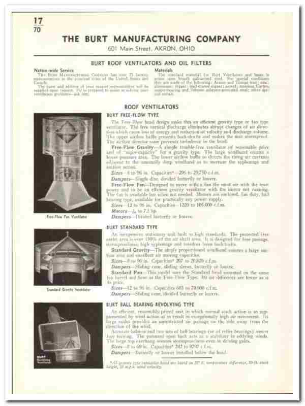 Products include Burt Free-Flow Type Roof Ventilators, Burt Standard Type Roof Ventilators, Burt Ball Bearing Revolving Type Roof Ventilators, Burt Monovent Continuous Ridge Type Roof Ventilators, Ventilator Dampers & Controls, Ventilator Bases and Oil Filtering Systems, all are fully featured.