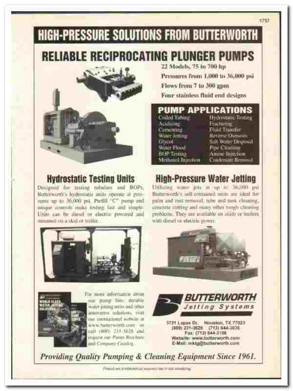 Original 1998 Oil and Gas trade vintage catalog for BUTTERWORTH JETTING SYSTEMS, INC. Main office and plant were located at 3721 Lapas Drive, Houston, TX.