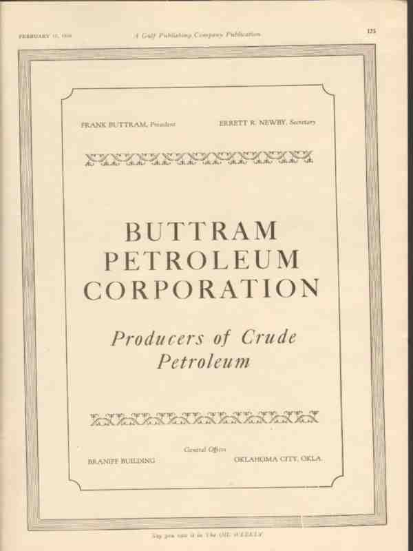 Original oil and gas trade magazine vintage ad for BUTTRAM PETROLEUM CORPORATION of Oklahoma City, OK. Producers of Crude Petroleum. Frank Buttram, President, Errett R. Newby, Secretary. Unique 1928 old petroleum production industry magazine advertisement.