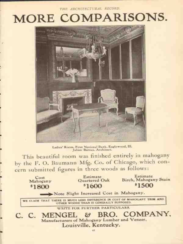 Original vintage furniture trade ad for C C MENGEL AND BROTHER COMPANY. Main office and factory was located in Louisville, KY. Pictured is the Ladies Room at the First National Bank in Englewood, IL. Julian Barnes, Architect. This beautiful room was finished entirely in mahogany by the F. O. Baumann Manufacturing Company of Chicago. Old 1910 architectural interior design and antique furniture magazine advertisement.