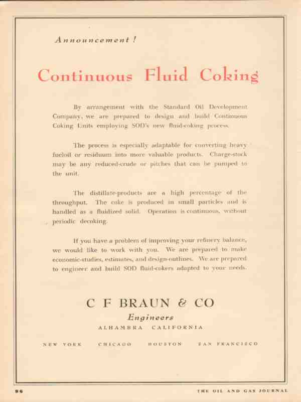 Original oil and gas trade vintage ad for C. F. BRAUN & COMPANY. Main office and factory was located in Alahambra, CA. Continuous Fluid Coking Units. This unique 1953 old petroleum refinery and process equipment magazine advertisement would display beautifully matted and framed.