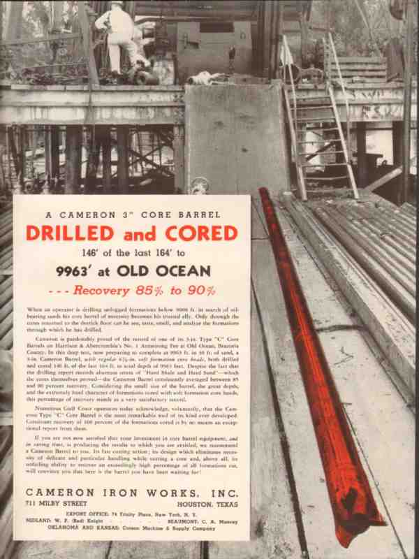 Original oil and gas trade magazine vintage ad for CAMERON IRON WORKS, INC. of Houston, TX. Core Barrel Drilled and Cored on Oilfield of Harrison and Abercrombie's No. 1 Armstrong Fee at Old Ocean, Brazoria County, Texas. This unique 1936 old oilfield petroleum drilling equipment magazine advertisement would display beautifully matted and framed.