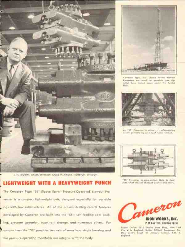 Original oil and gas trade magazine vintage ad for CAMERON IRON WORKS, INC. of Houston, TX. Lightweight With a Heavyweight Punch. Cameron Type @@ Pressure Operated Blowout Preventer. Pictured is I.M. Squirt Baker, Division Sales Manager, Houston Division. This unique 1954 old oilfield petroleum drilling industry equipment magazine advertisement.