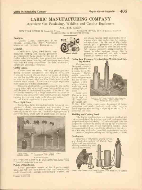 Original industrial trade vintage catalog for CARBIC MANUFACTURING COMPANY, was located in Duluth, MN.   Manufacturers of acetylene gas producing equipment. Low pressure oxy-acetylene welding and cutting outfits, torches, Carbic cakes, generators.  Disbound from a large 1916 industrial catalog, this unique old one page technical brochure would display wonderfully matted and framed. A marvelous addition to your retro industrial equipment library. Page is detached and may contain a small amount of residual glue on edge.