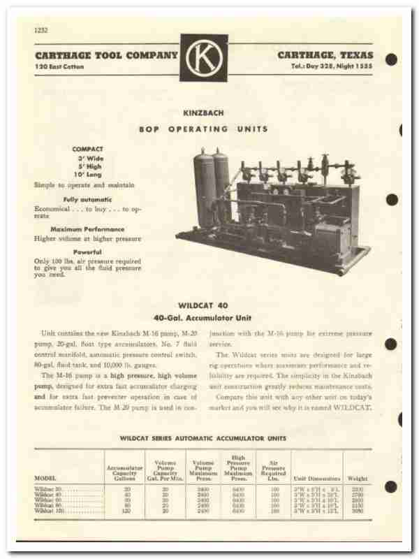 Products include Kinzbach BOP Operating Units, Wildcat 40 - 40-Gal Accumulator Unit, K-7 Model Operator, K-14 Model Operator Accumulator Unit, K-1 Model Operator, K-2 Model Operator Air Unit, K-11 Model Operator Accumulator Unit, Kinzbach Pumps, Fluid Control Manifolds and Check Valves are all featured.