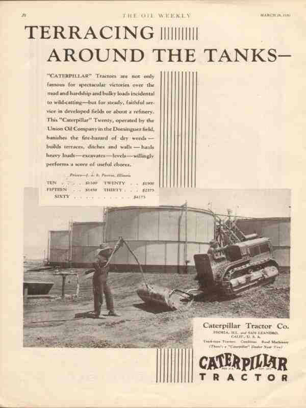 Original oil and gas drilling industry trade magazine vintage ad for CATERPILLAR TRACTOR COMPANY of Peoria, IL. Terracing Around the Tanks. Caterpillar Twenty, operated by the Union Oil Company in the Dominguez field, banishes the fire hazard of dry weeds, builds terraces, ditches and walls, hauls heavy loads, excavates. Old 1930 petroleum equipment magazine advertisement.