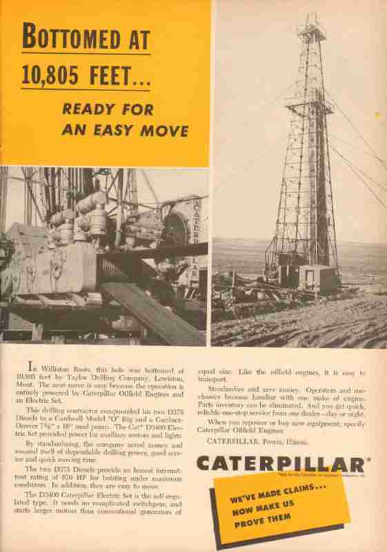 Original oil and gas trade magazine vintage ad for CATERPILLAR TRACTOR COMPANY of Peoria, IL. Taylor Drilling in Lewiston, MT hole bottomed out at 10,805 feet. The next move is easy because the operation is entirely powered by Cat oilfield Engines and an Electric Set. This unique 1953 old oilfield petroleum tractor equipment magazine advertisement would display beautifully matted and framed.