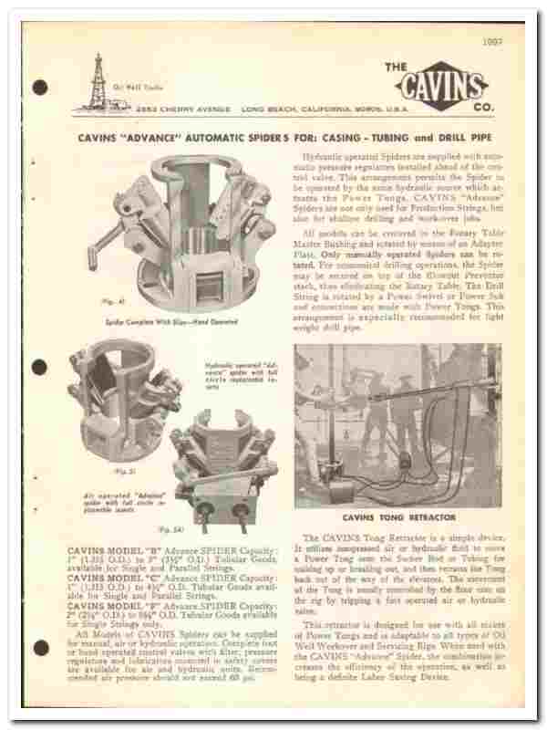 Products include 'Advance' Automatic Spiders for Casing, Tubing & Drill Pipe, Cavins Depthometer, Rod Type Sand Pumps, Rubber Plungers, Metal Plungers, Junk Baskets, Skeeter Bill, Cavins Hydrostatic Bailer, Cavins Cement Dump, Bridging Plugs and Tork-Master Electric Valve Operators, all are fully featured.