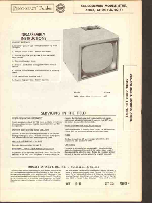 Vintage CBS-COLUMBIA models 6T101, 6T103 and 6T104 (Ch. 2017) TV television receiver. Original old Sams Photofact manual includes schematic, layout, alignment instructions, voltage & resistance test chart, repair parts list and description.16 pages. Dated 1956. This manual would make a sensational accompaniment to your classic video TV equipment.
