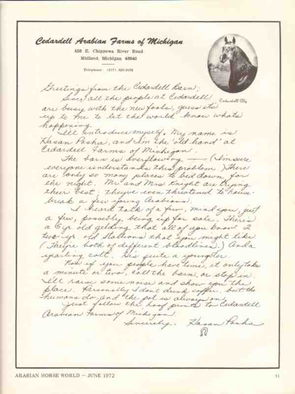 cedardell arabian farms michigan 1972 aly hasan pasha horse vintage ad
