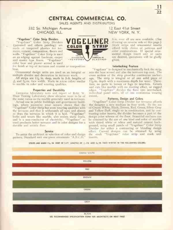 Original concrete trade vintage catalog for CENTRAL COMMERCIAL COMPANY. Main office was located at 332 South Michigan Avenue, Chicago, IL., also located at 12 East 41st Street, New York City, NY. Manufacturers of Vogeliner Color Strip Dividers, made of tempered plastics for terrazzo, cement, composition, floor and walls. Disbound from a large 1938 building material construction book, this unique old two page technical data specification brochure would look sensational matted and framed. Would make a marvelous addition to your retro architecture design and engineering library.