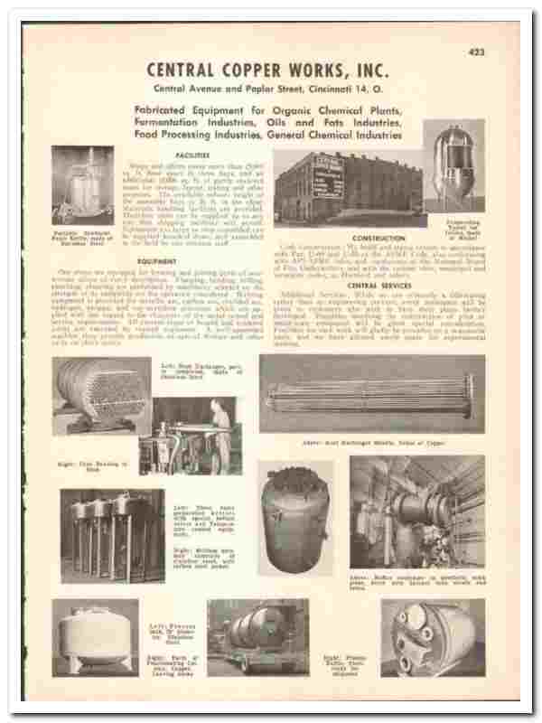 Original 1947 industrial trade vintage catalog for CENTRAL COPPER WORKS, INC. Main office and plant were located at Central Avenue and Poplar Street, Cincinnati, OH.