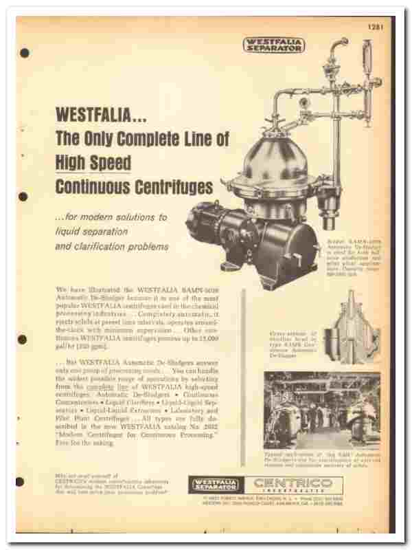Manufacturers of a Complete Line of Westfalia High Speed Continuous Centrifuges. 'For Modern Solutions to Liquid Separation and Clarification Problems'.