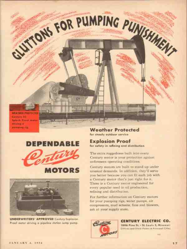 Original vintage oil and gas trade magazine ad for CENTURY ELECTRIC COMPANY of St. Louis, MO. Gluttons for Pumping Punishment. Weather Protected Century SC Splash Proof Motor driving a Pumping Rig. Old 1954 petroleum industry oilfield and refinery advertisement.