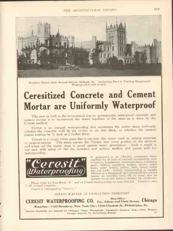 Original vintage architectural trade magazine ad for CERESIT WATERPROOFING COMPANY of Chicago, IL. Ceresitized Concrete and Cement Mortar are Uniformly Waterproof. Pictured is Northern Illinois State Normal School, DeKalb, IL. Swimming Pool in Training Department Waterproofed with Ceresit. Old 1912 construction industry advertisement.
