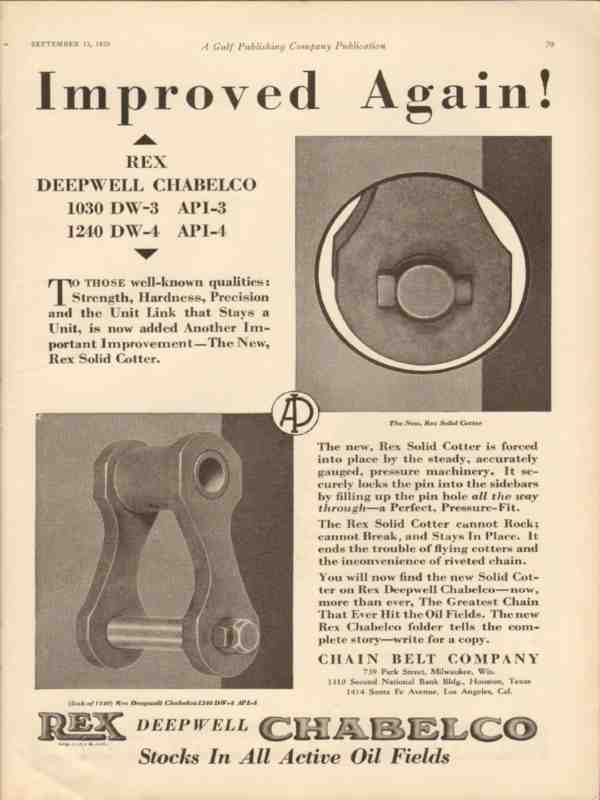 Original oil and gas trade magazine vintage ad for CHAIN BELT COMPANY of Milwaukee, WI. Improved Again! Rex Deepwell Chabelco, Rex Solid Cotter. Unique 1929 old oilfield petroleum drilling equipment magazine advertisement.