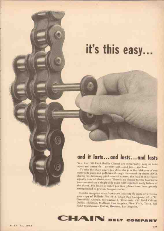 Original oil and gas trade magazine vintage ad for CHAIN BELT COMPANY of Milwaukee, WI. Easy oil field roller chains last and last. Pin holes in inner pin link plates have been greatly strengthened to prevent fatigue cracks. This unique 1955 old oilfield petroleum drilling equipment magazine advertisement would display beautifully matted and framed.