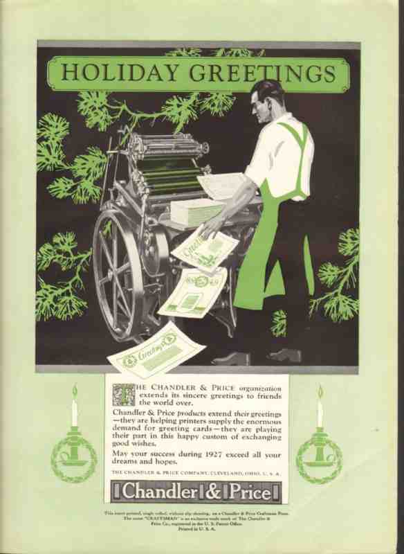 Original vintage ad for CHANDLER AND PRICE in Cleveland, OH. Holiday Greeting. Helping printers supply the enormous demand for greeting card, playing their part in this happy custom of exchanging good wishes. On the reverse side is End the Year by ending cutting troubles with Craftsman Paper Cutter. This 1926 unique old two sided printing industry trade magazine advertisement would display beautifully matted and framed.
