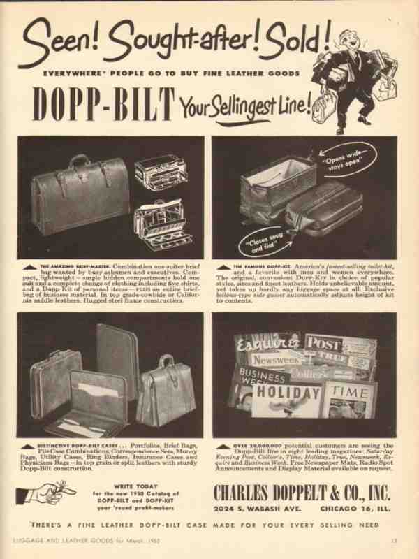Original leather goods trade magazine vintage ad for CHARLES DOPPELT & COMPANY, INC. Main office and plant was located at 2024 South Wabash Avenue, Chicago, IL. Seen! Sought After! Sold! Dopp Bilt Your Sellingest Line! Brief Master and Dopp Kit are featured. This unique 1950 old leather industry magazine advertisement would display wonderful matted and framed. Nice graphics.