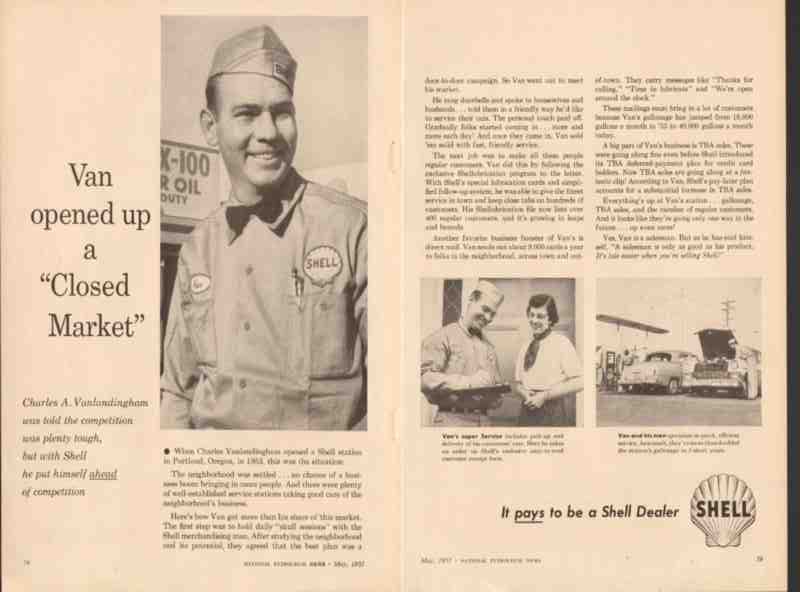 Original old automobile repair trade magazine vintage ad for Charles A. VANLANDINGHAM SHELL service station in Portland, Oregon. Used a door-to-door campaign to meet his market.  He rang doorbells and spoke to housewives and husbands and told them he'd like to service their cars  This unique 1957 2 page gatefold petroleum advertisement would display beautifully matted and framed.