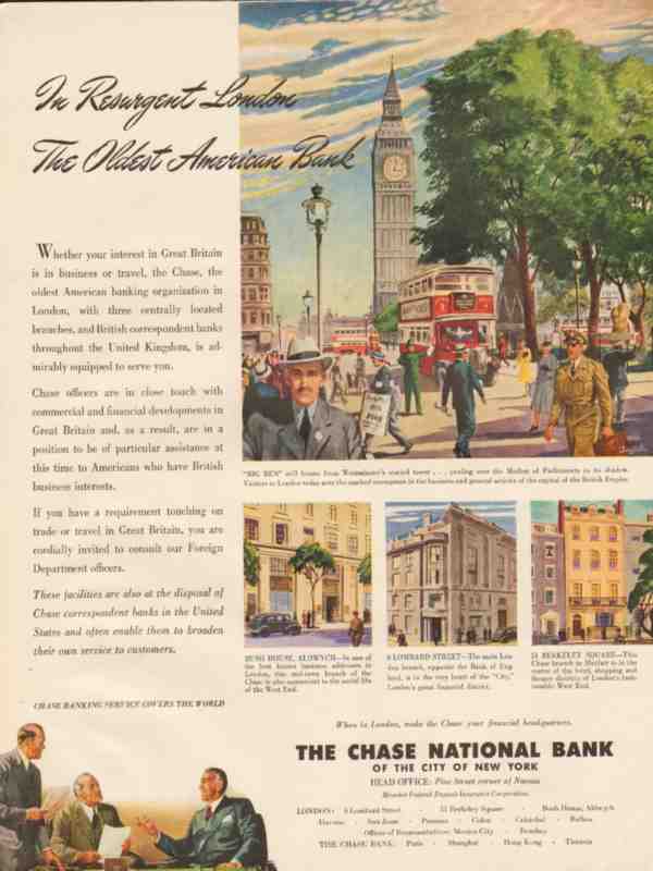Original old banking and financial trade magazine ad for THE CHASE NATIONAL BANK OF THE CITY OF NEW YORK. In Resurgent London The Oldest American Bank. Branches at Bush House, Aldwych, 6 Lombard Street in London, and 51 Berkeley Square in Mayfair. This 1947 magazine advertisement would display beautifully matted and framed.