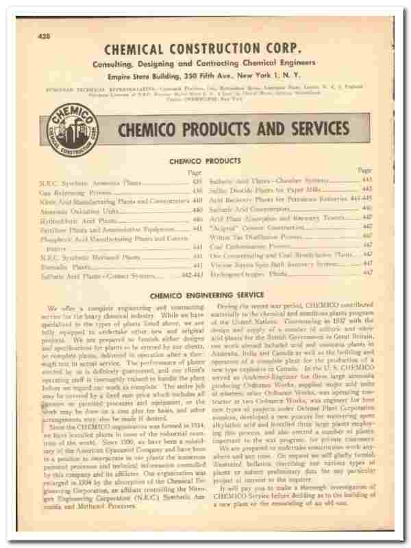 Original 1948 industrial trade vintage catalog for the CHEMICAL CONSTRUCTION CORPORATION. (CHEMICO). Main office was located in the Empire State Building, 350 Fifth Avenue, New York, NY.