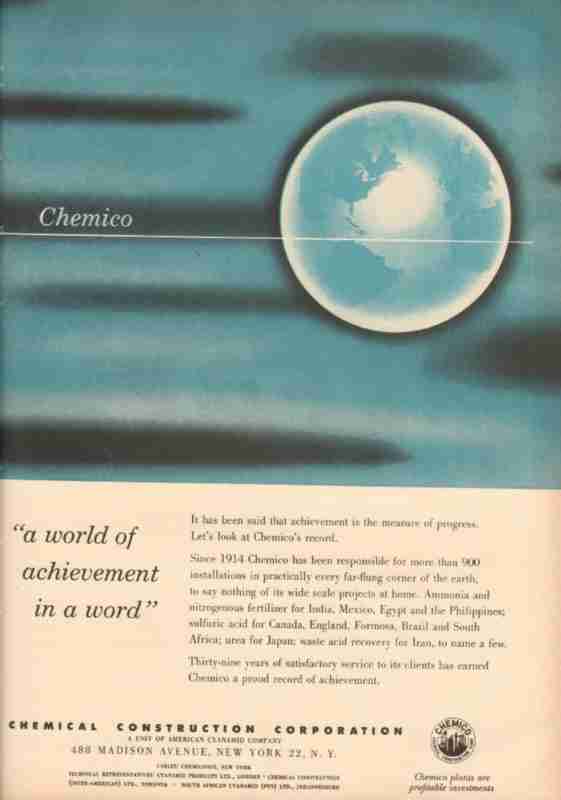 Original oil and gas vintage magazine ad for CHEMICAL CONSTRUCTION CORPORATION. Chemico, a world of achievement in a word. Responsible for more than 900 installations in every corner of the earth. Ammonia and nitrogenous fertilizer for India, Mexico, Egypt and the Philippines, sulfuric acid for Canada, England, Formosa, brazil and South Africa.