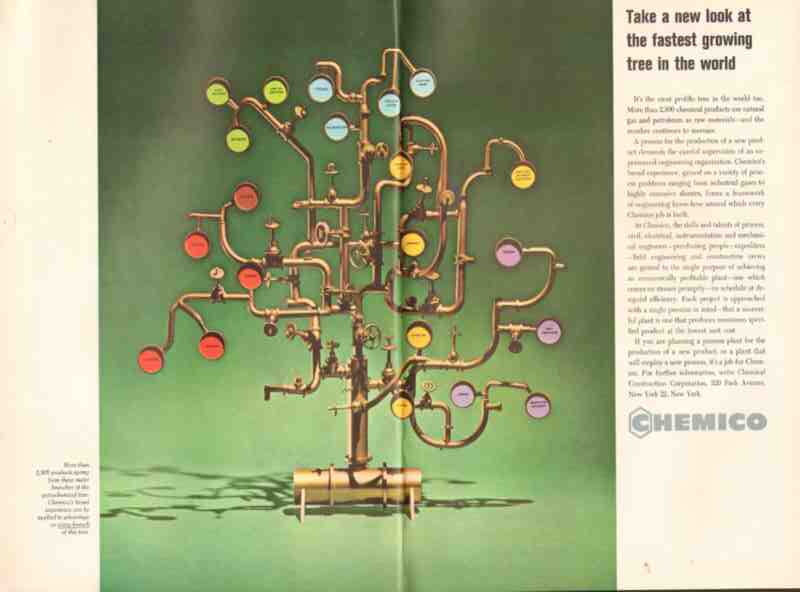 Original oil and gas trade vintage ad for CHEMICAL CONSTRUCTION. CORPORATION. Main office and factory was located in New York City, NY. Chemico, fastest growing tree in the world. More than 2,500 petrochemical products use natural gas and petroleum as raw materials. This unique 1962 old oilfield industry magazine advertisement would display beautifully matted and framed. Two-page gatefold advertisement. Great graphics.
