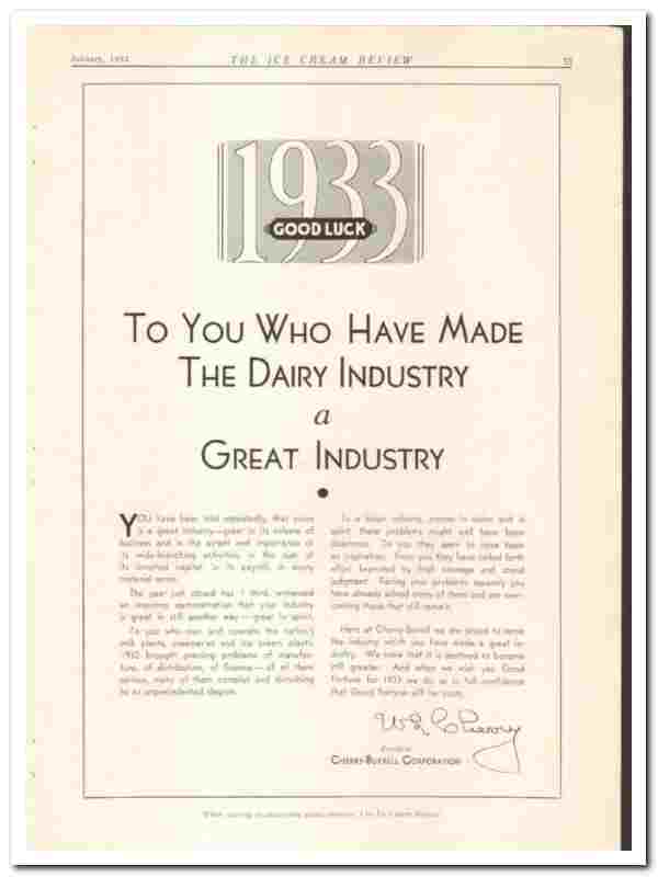 Original 1933 dated ice cream vintage magazine ad for the CHERRY-BURRELL CORPORATION. Main office and plant were located at 427 West Randolph Street, Chicago, IL.