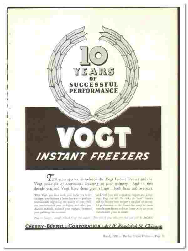 Manufacturers of Vogt Instant Freezers for Ice Cream. '10 Years of Successful Performance'.