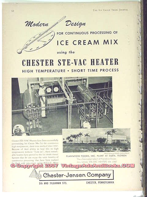 Original ice cream trade magazine vintage ad for CHESTER-JENSEN COMPANY. Main office and factory was located at 5th and Tilghman Streets, Chester, PA. Manufacturers of ice cream equipment. For Continuous Processing of Ice Cream Mix using the Chester Ste-Vac Heater. High Temperature and Short Time Process. Pictured at the Plantation Foods, Inc. plant in Uleta, Florida. This unique 1951 old dairy industry magazine advertisement would display wonderful matted and framed. Nice graphics. Approximate size 8 x 11 inches.