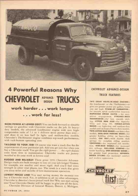 chevrolet 1953 elkton gas company advanced design truck vintage ad