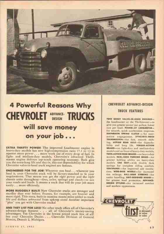 Original commercial fleet vintage magazine ad for CHEVROLET. J. Marcus Wood in Longview, TX Gulf Oil truck is pictured. Chevy trucks will save money on y our job. The improved Loadmaster engine in heavy-duty models has new high compression ratio to squeeze more power and work out of every drop of fuel,