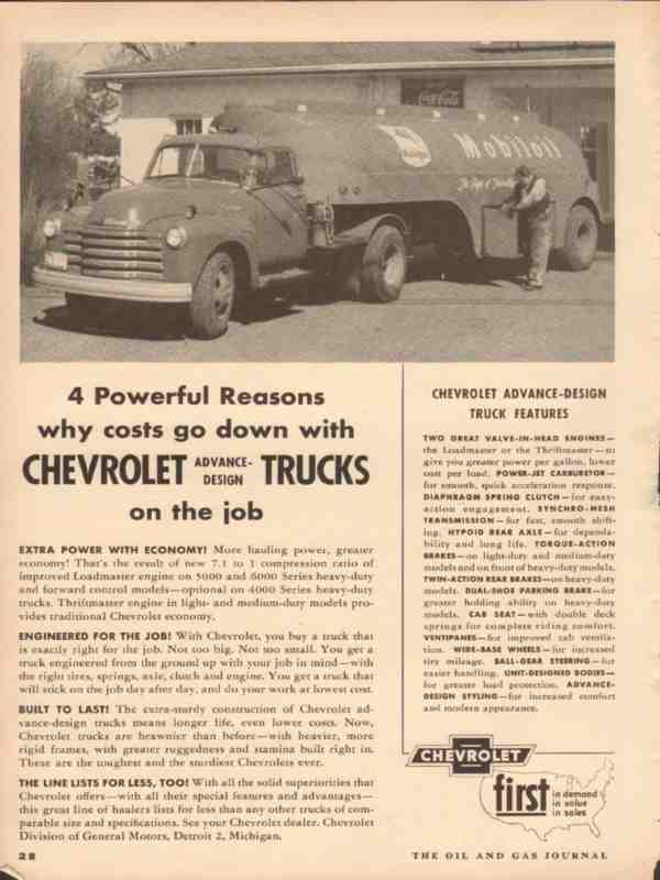 Original old petroleum industry trade magazine vintage ad for CHEVROLET. On the Job Powerful Reasons Why Costs Go Down with Chevrolet Trucks. This 1953 oil and gas equipment magazine advertisement would display beautifully matted and framed.