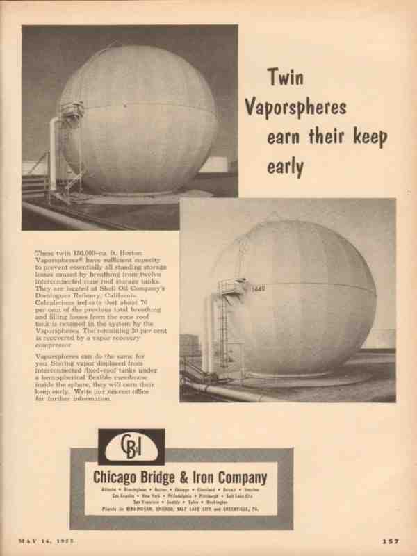 Original oil and gas trade magazine vintage ad for CHICAGO BRIDGE & IRON COMPANY, CB&I, of Atlanta, GA. Birmingham, AL. Boston, MA. Chicago, IL. Cleveland, OH. Detroit, MI. Houston, TX. Los Angles, CA. New York City, NYC. Philadelphia, PA. Pittsburgh, PA. Salt Lake City, UT. San Francisco, CA. Seattle, WA. Tulsa, OK. and Washington. Twin Vaporspheres Earn Their Keep Early, located at Shell Oil Company's Dominguez Refinery, California. Unique 1955 old petroleum products storage industry magazine advertisement would look fantastic matted and framed.