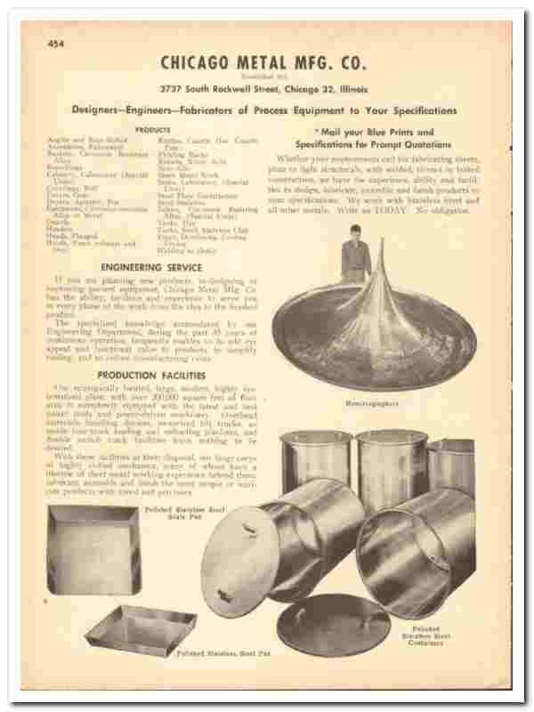 Original 1948 industrial trade vintage catalog for the CHICAGO METAL MANUFACTURING COMPANY. Main office and plant were located at 3737 South Rockwell Street, Chicago, IL. (Established 1913).
