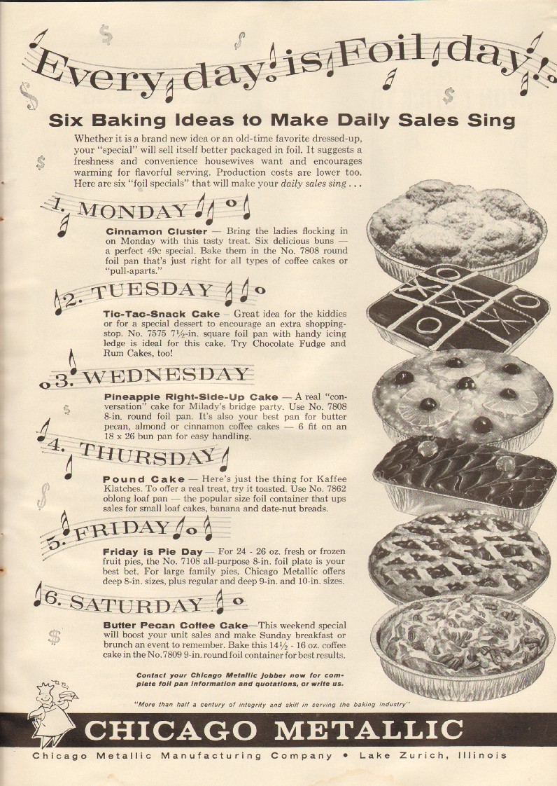Original commercial bakery trade magazine vintage ad for CHICAGO METALLIC MANUFACTURING COMPANY in Lake Zurich, IL. Every day is Foil day. Six baking ideas to make daily sales sing. Cinnamon Cluster, Tic-Tac-Snack Cake, Pineapple Right Side Up Cake, Pound Cake, Friday is Pie Day, Butter Pecan Coffee Cake. 1959 unique old baking industry advertisement.
