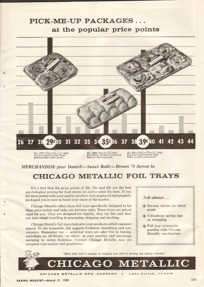 Original commercial baker trade magazine vintage ad for CHICAGO METALLIC MANUFACTURING COMPANY in Lake Zurich, IL. Foil trays pick me up packages for your Danish, Sweet Rolls, Born and Serves. The price points of 29, 35 and 39 cents are the best psychological pricing for food stores. These trays are priced right for you. To the housewife, foil suggests freshness, cleanliness and convenience. 1959 unique old baking industry advertisement.