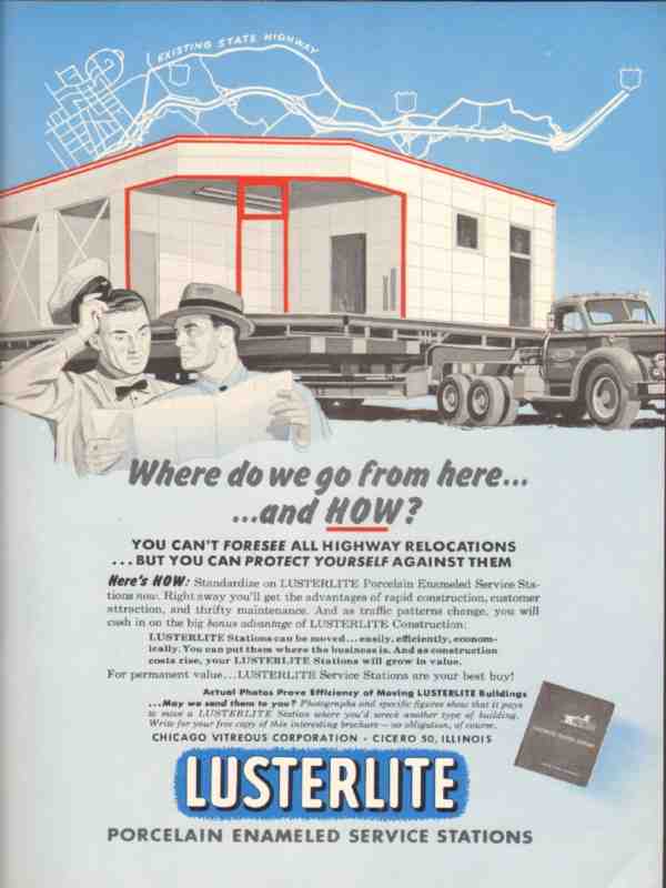 Original old retail petroleum trade magazine vintage ad for CHICAGO VITREOUS CORPORATION of Cicero, IL. Lusterlite Service Stations. You Can't foresee all Highway Relocations but you can protect yourself against them. This unique old 1957 portable gas station advertisement would display beautifully matted and framed