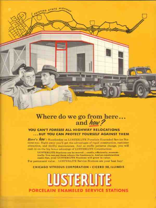 Original old retail petroleum trade magazine vintage ad for CHICAGO VITREOUS CORPORATION of Cicero, IL. Lusterlite Porcelain Enameled Service Stations. Protect Yourself Against Highway Relocations. This unique old gold 1957 gas station advertisement would display beautifully matted and framed
