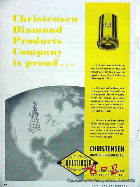 Original oil and gas trade vintage ad for CHRISTENSEN DIAMOND PRODUCTS. COMPANY. Main office and factory was located at 1937 South Second West, Salt Lake City, UT. Christensen Diamond Products is proud to have been a factor in the oil industry, to have established new techniques and diamond core bit equipment. This unique 1951 old oilfield petroleum drilling equipment magazine advertisement would look fantastic matted and framed.