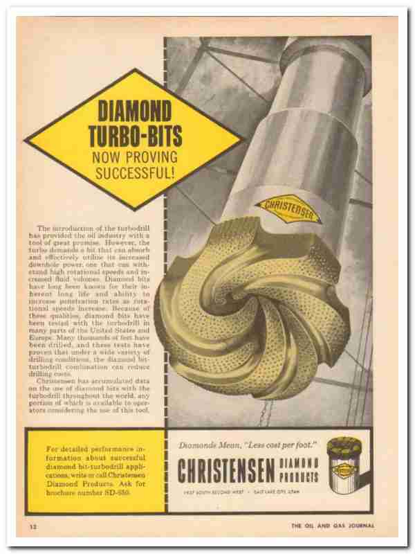Original oil and gas trade magazine vintage ad for CHRISTENSEN DIAMOND PRODUCTS COMPANY. General offices were located at 1937 South Second West, Salt Lake City, UT. Turbo-Bits proving successful! The introduction of the turbodrill has provided the industry with a tool of great promise, However, the turbo demands a bit that can absorb and effectively utilize its increased downhole power, can withstand high rotational speeds and increased fluid volumes. This unique 1959 old oilfield petroleum drilling industry equipment magazine advertisement would display beautifully matted and framed. Wonderful graphics.